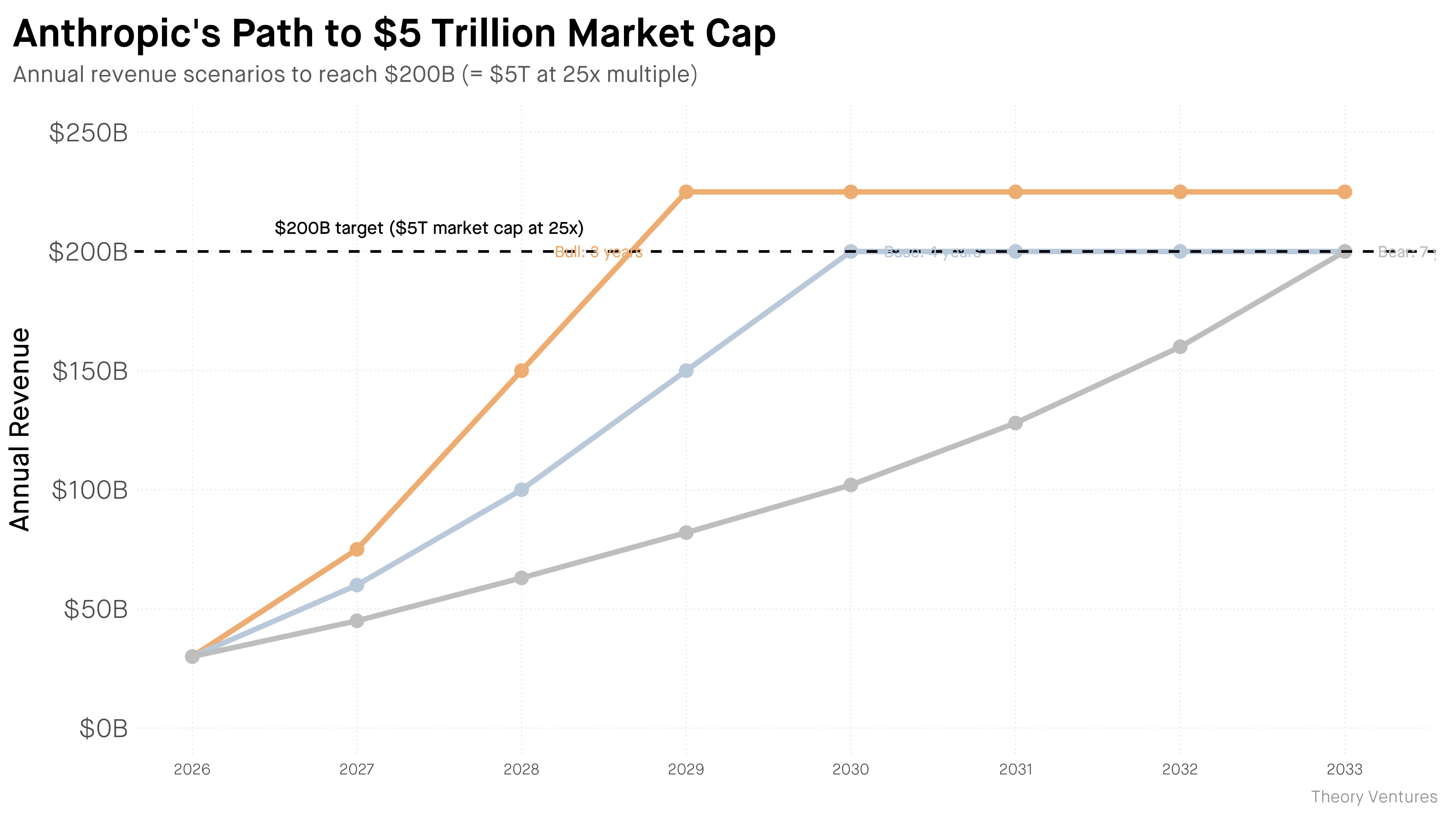NVIDIA generates $215b in annual revenue & trades at 22x, producing a $4.8 trillion market cap. To surpass it, Anthropic needs $200b in annual revenue1. If growth continues, three years. If it decelerates steadily, four. If it normalizes rapidly, seven2.