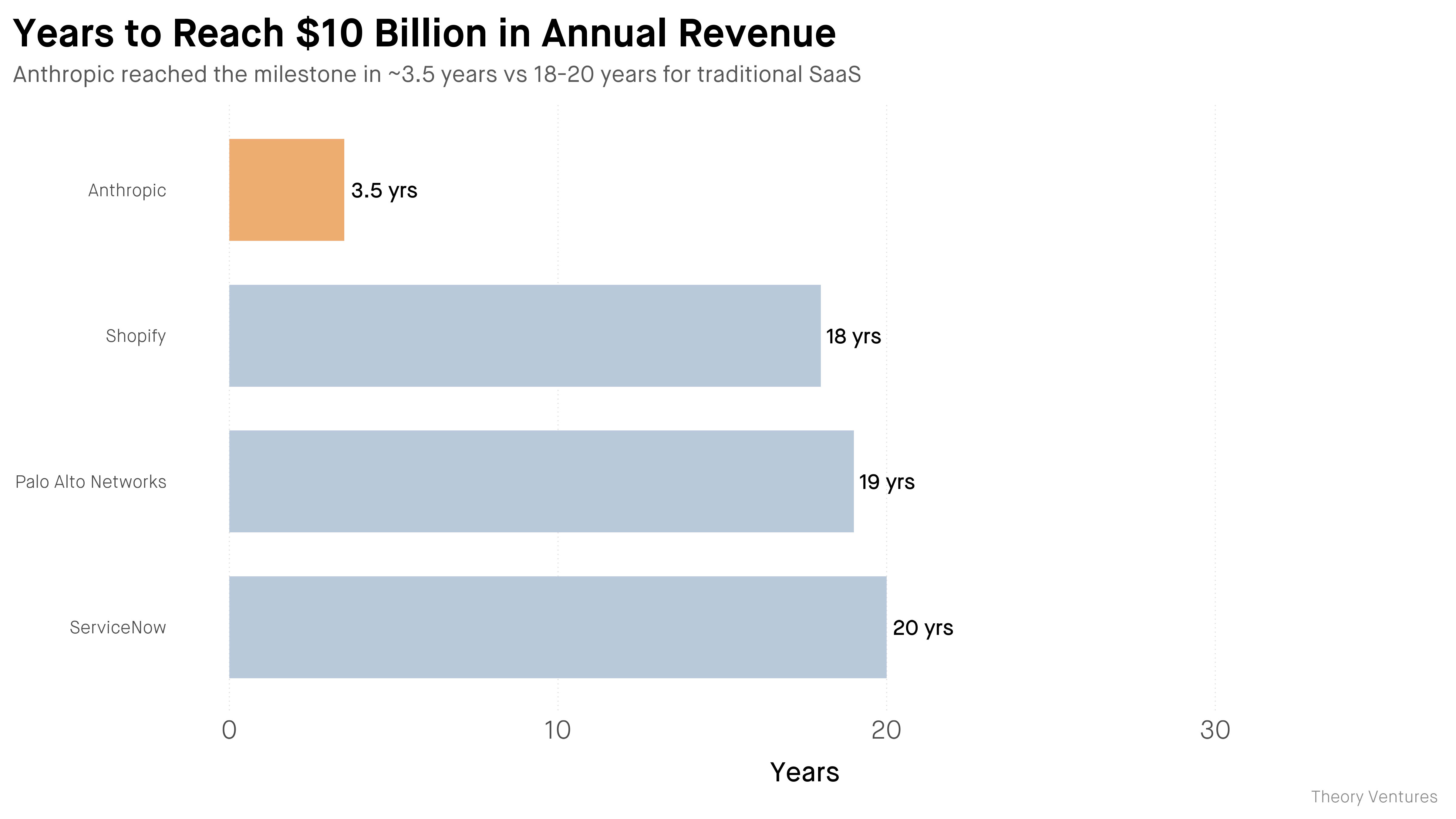 Crossing $10b is a milestone few software companies ever reach: ServiceNow took 20 years, Shopify took 18, Palo Alto Networks took 19, & Anthropic crossed that threshold in under four years.