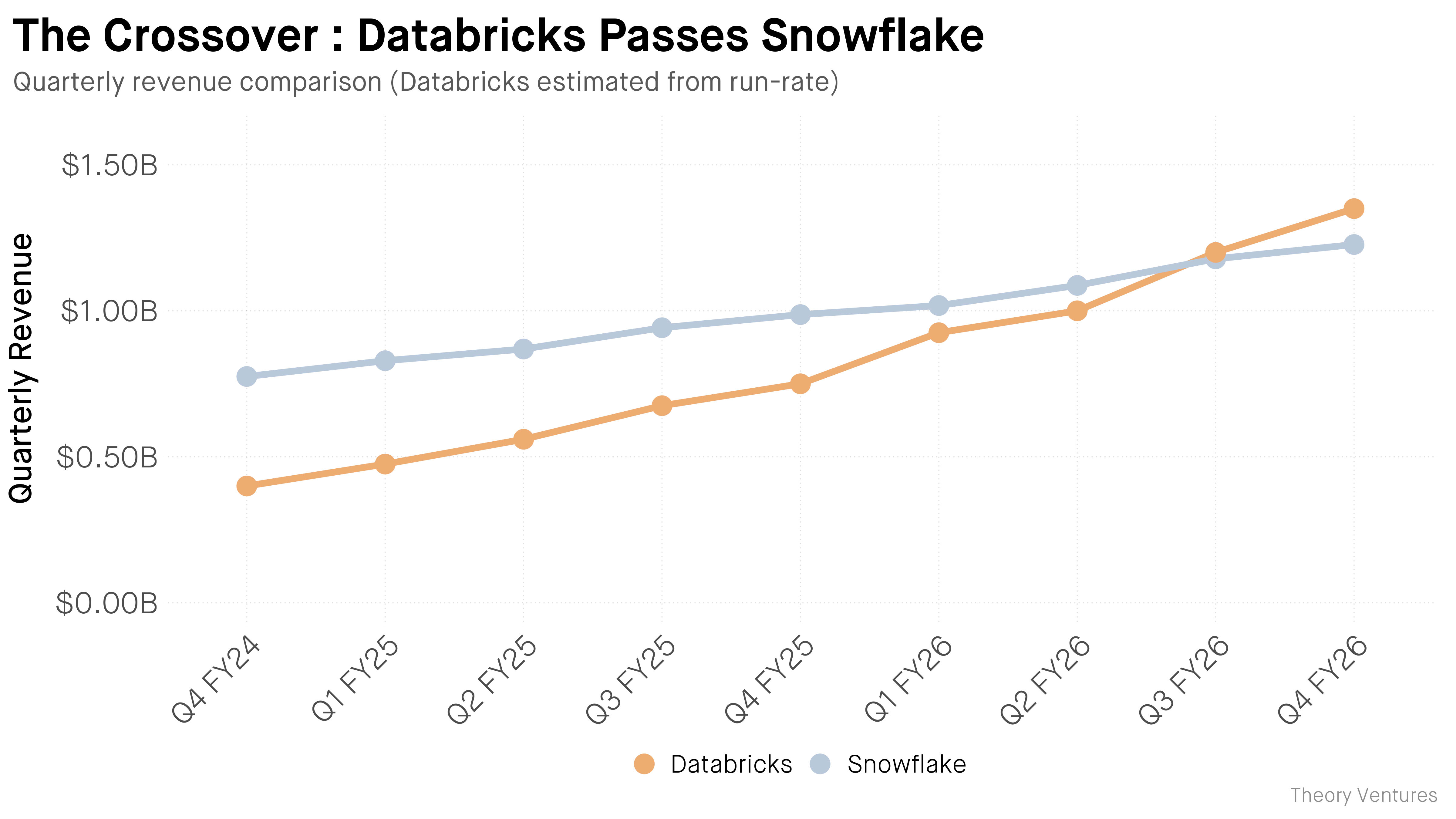 Databricks has overtaken Snowflake in revenue. Two years ago, Snowflake led by $220 million per quarter. Today, Databricks leads by $120 million. Databricks’ growth rate is accelerating at scale, from 50% to 55% to 65% year over year. Growth rates don’t accelerate at $5 billion in revenue.