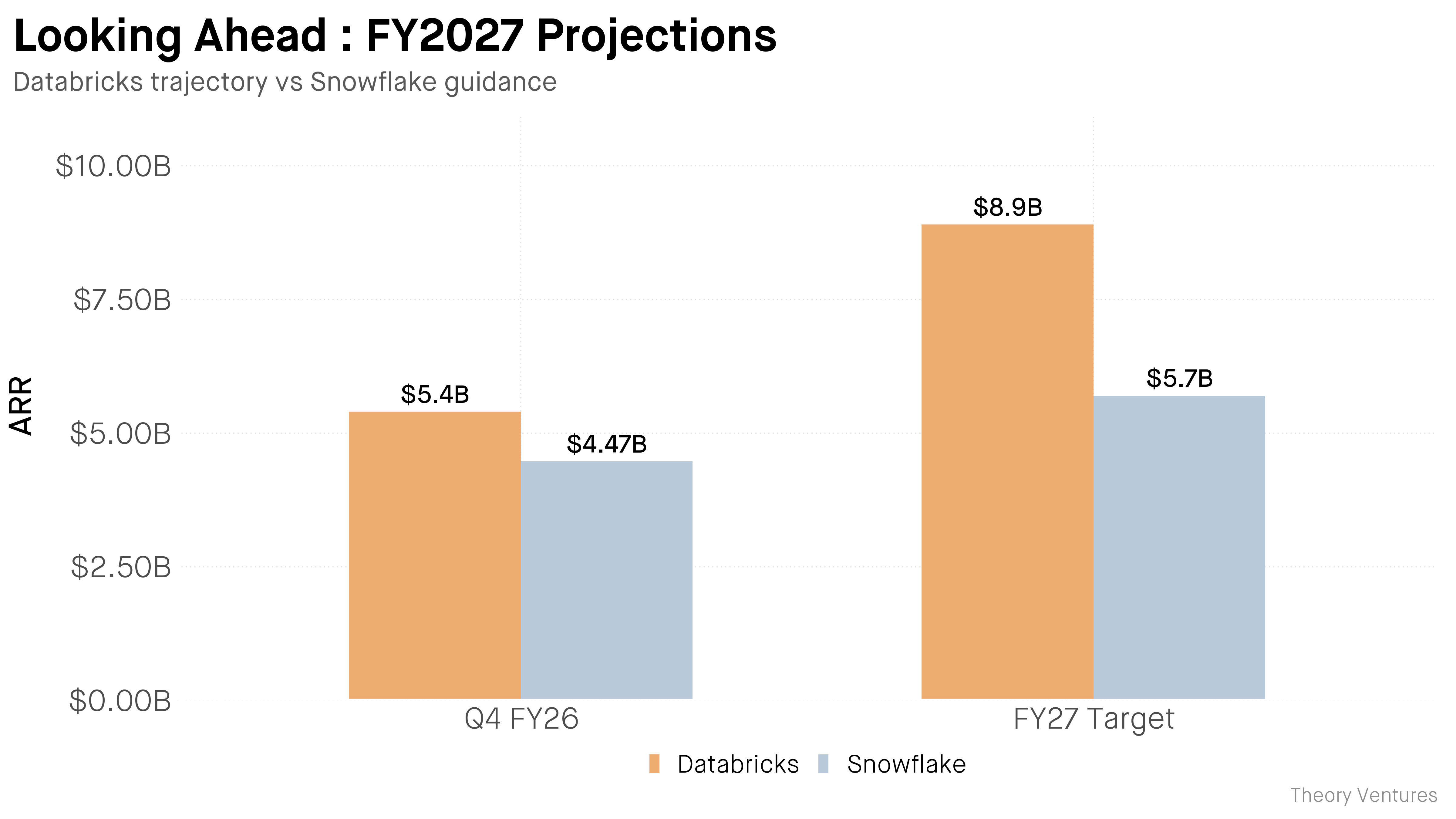 By FY27, the gap widens further. Databricks projects $8.9 billion. Snowflake guides to $5.7 billion.