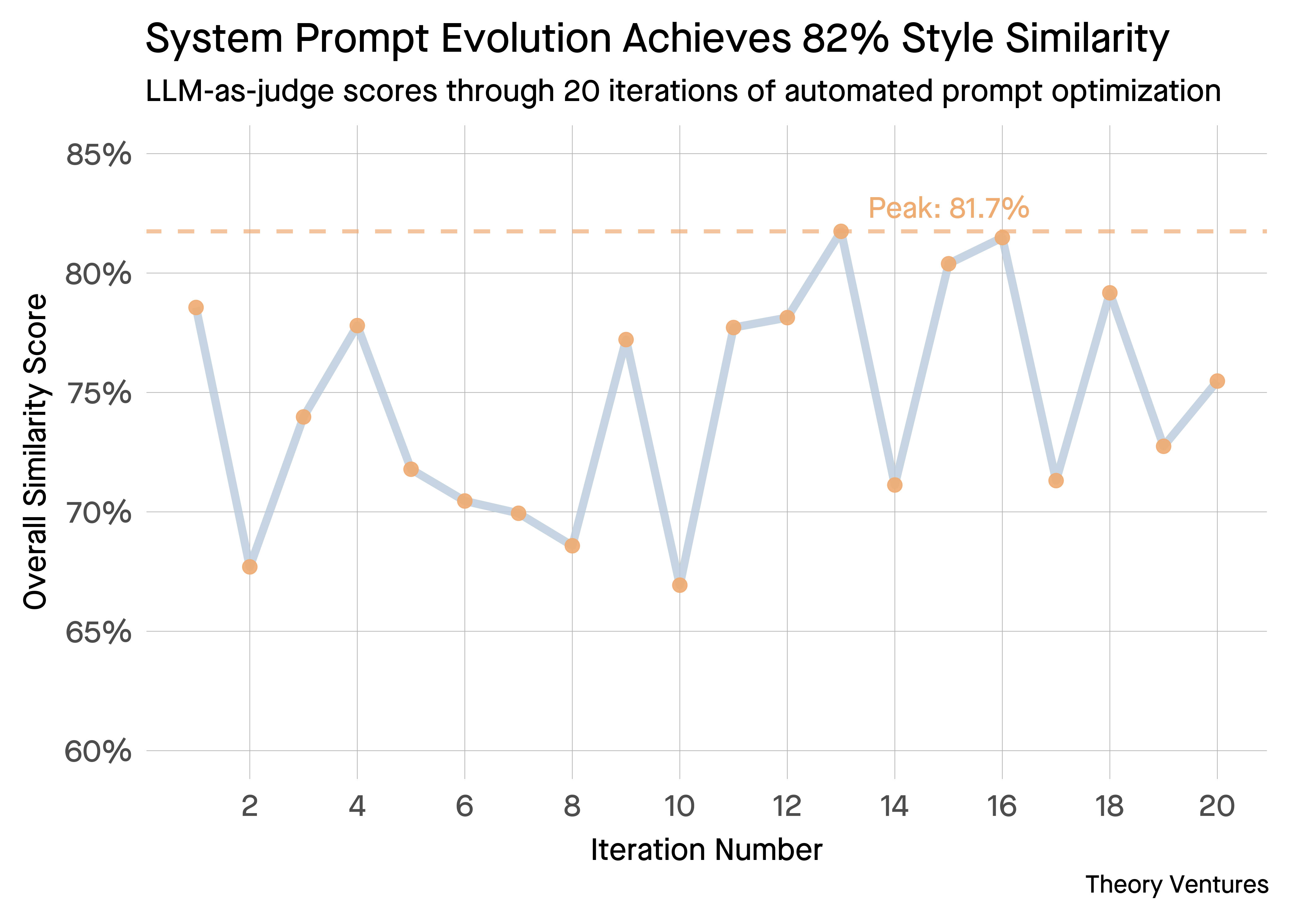 The LLM judge experiment yielded mixed results. The chart shows swings in performance across 20 iterations, with no clear convergence pattern. The best run achieved 81.7% similarity to my writing style, a 3.1 percentage point improvement over the initial 78.6%.