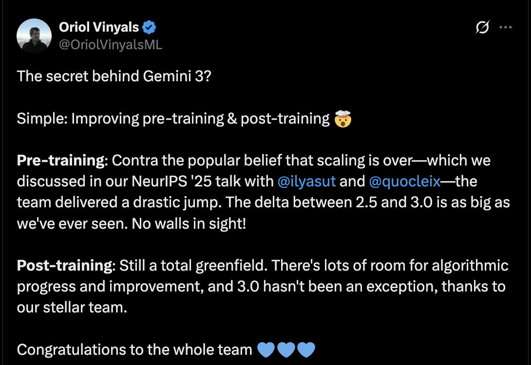 Oriol Vinyals, VP of Research at Google DeepMind, credited improving pre-training & post-training for the gains. He continued that the delta between 2.5 & 3.0 is as big as Google has ever seen with no walls in sight.