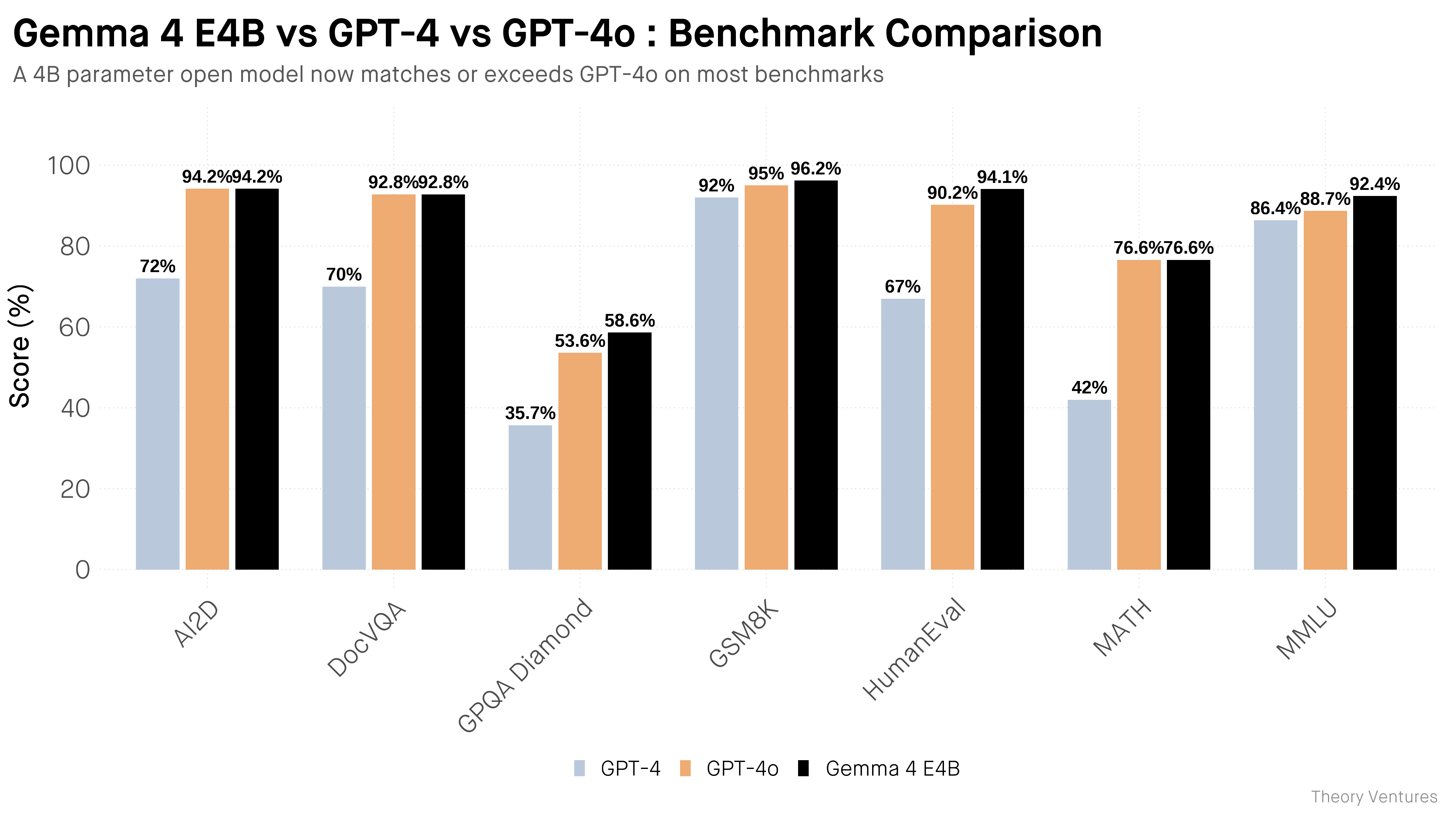 Gemma 4 E4B matches or exceeds GPT-4o across multiple benchmarks including MATH, GSM8K, GPQA Diamond & HumanEval. Full benchmark comparison ↩︎