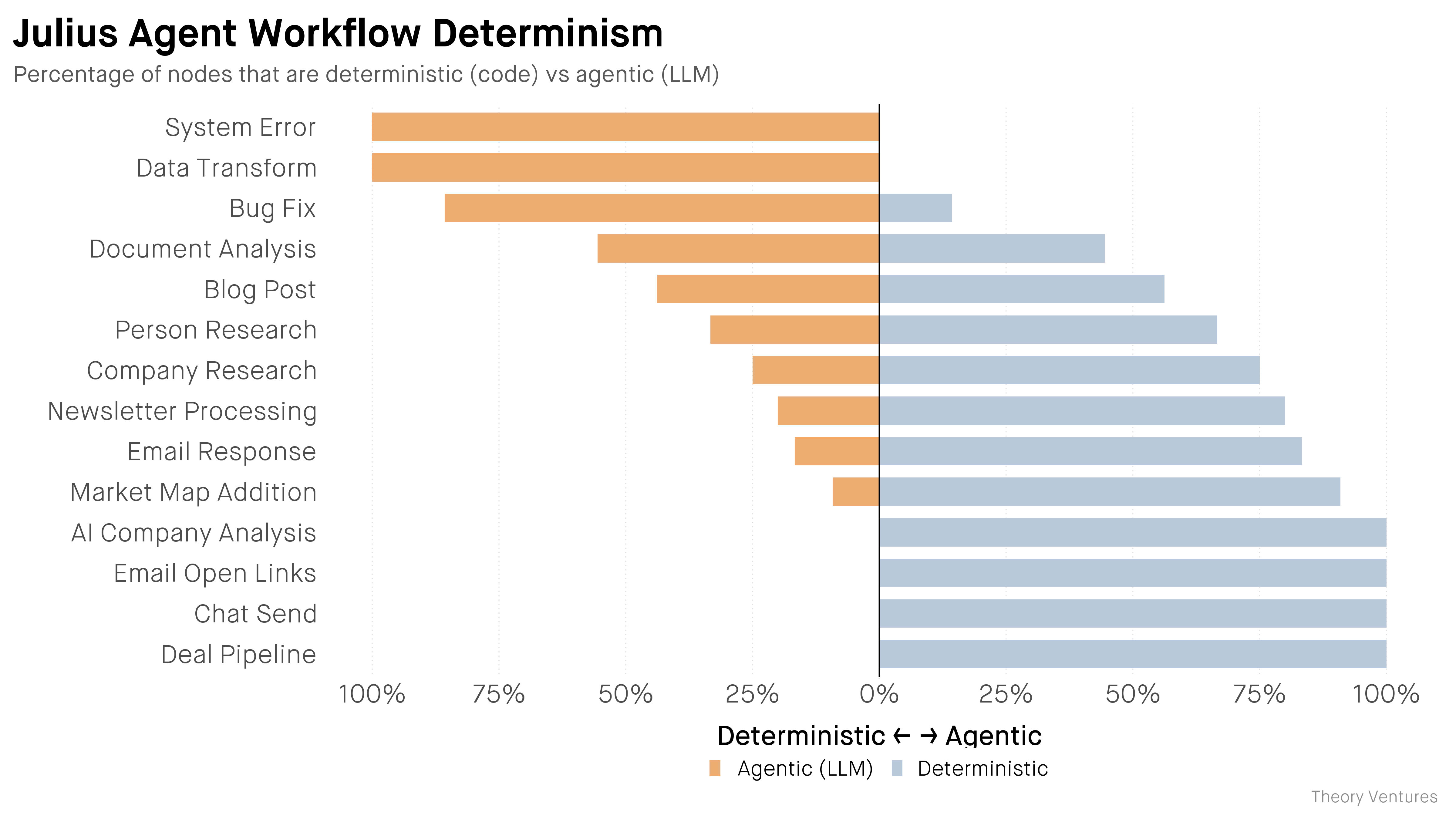 Only 14% remain fully agentic. Data transforms & error investigations. These tend to be coding tasks rather than evaluating a decision point in a workflow. The LLM needs freedom to explore.
