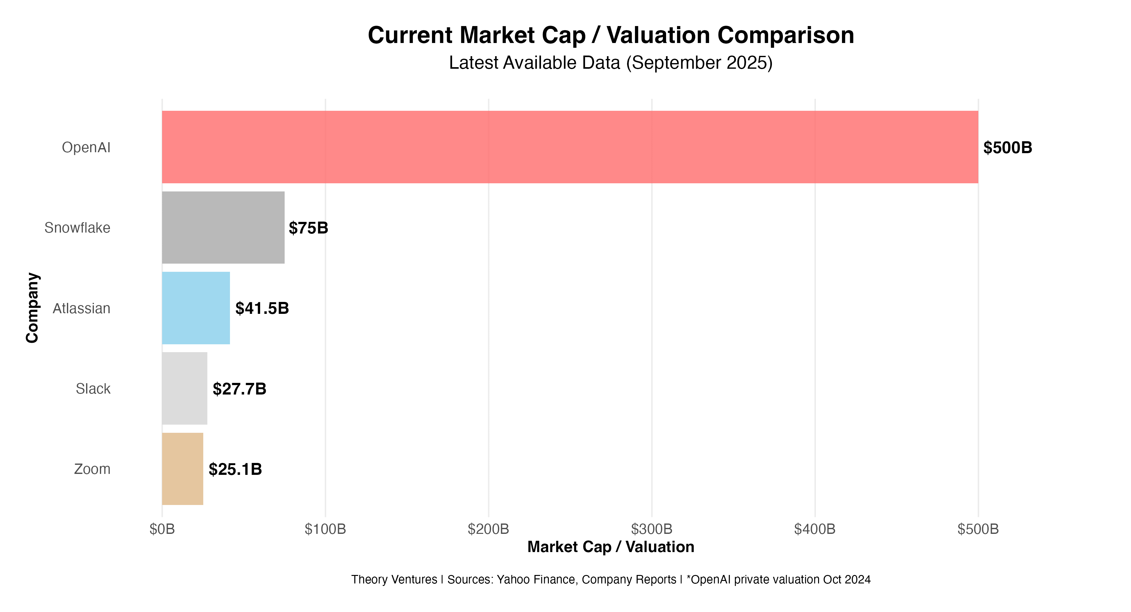 Compare OpenAI’s 400% growth at $1b revenue to Atlassian’s 30%. Or Snowflake at 124%. Snowflake is $75b market cap today, Atlassian $42b. The advantage of a head of steam is clear.