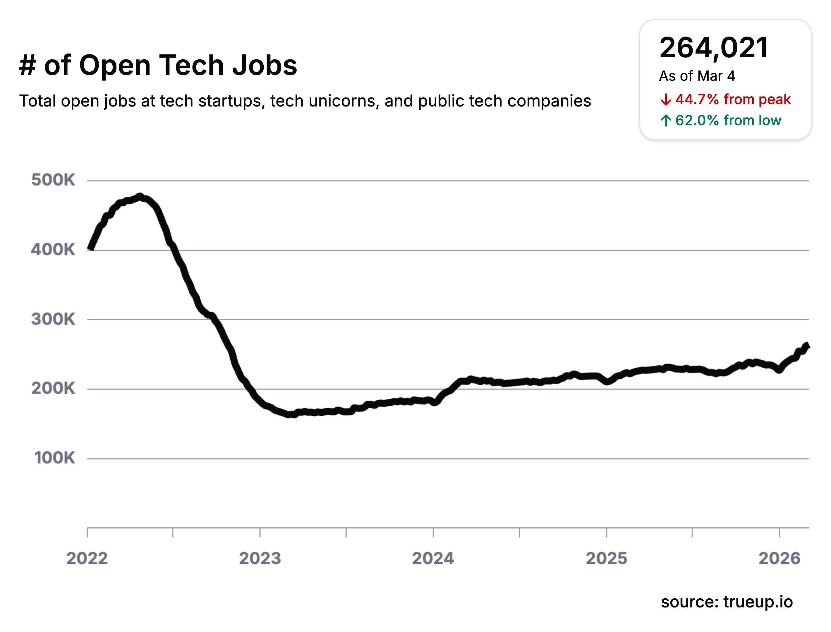 Tech job openings are down 45% from the 2022 peak, but up 16% since the start of 2026 - from 227k to 264k. Why the narrative violation?