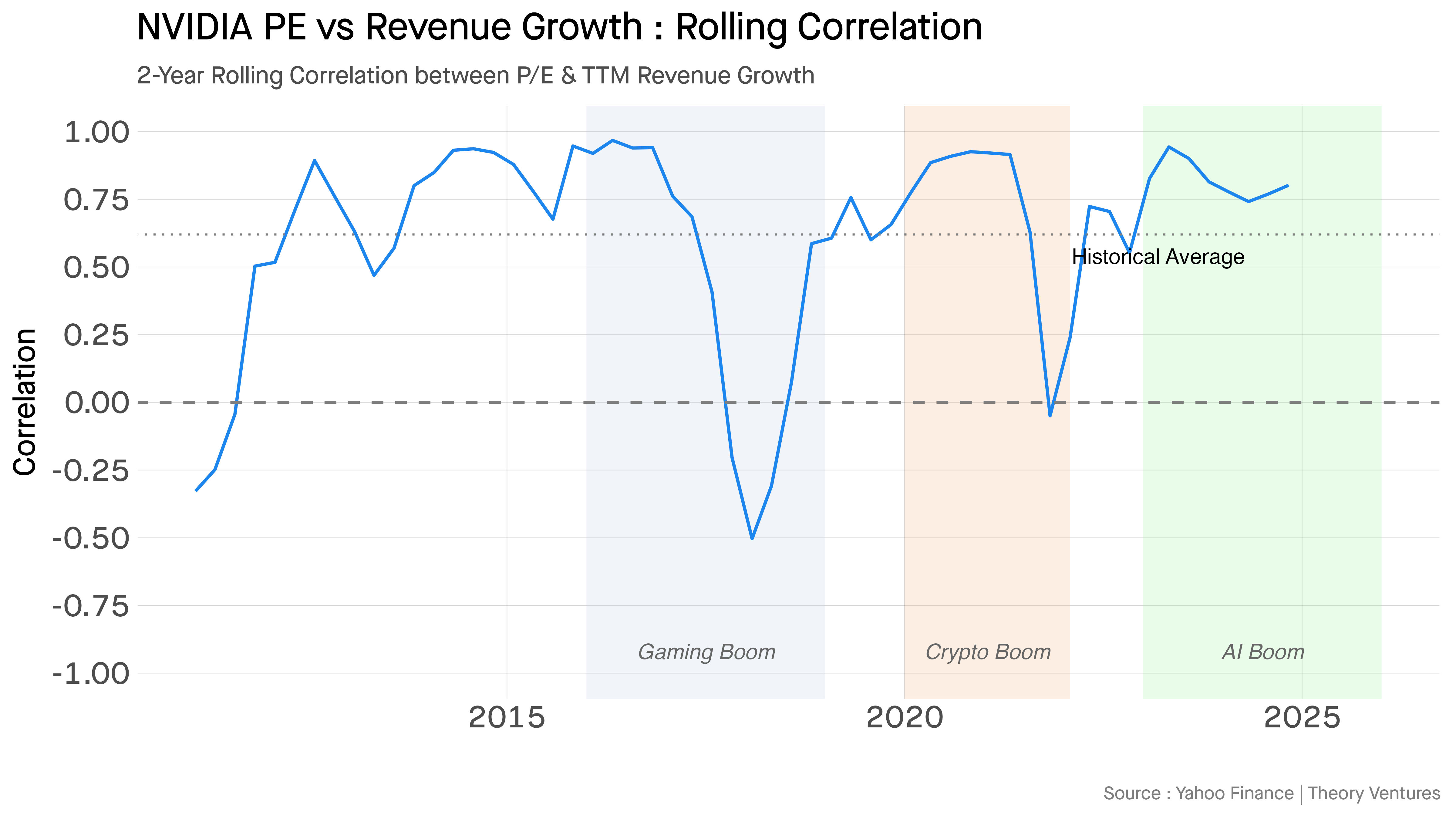 At the end of each boom, the correlation collapses, falling to zero or even turning negative. P/E stays elevated while revenue growth plummets. The market is slow to reprice.