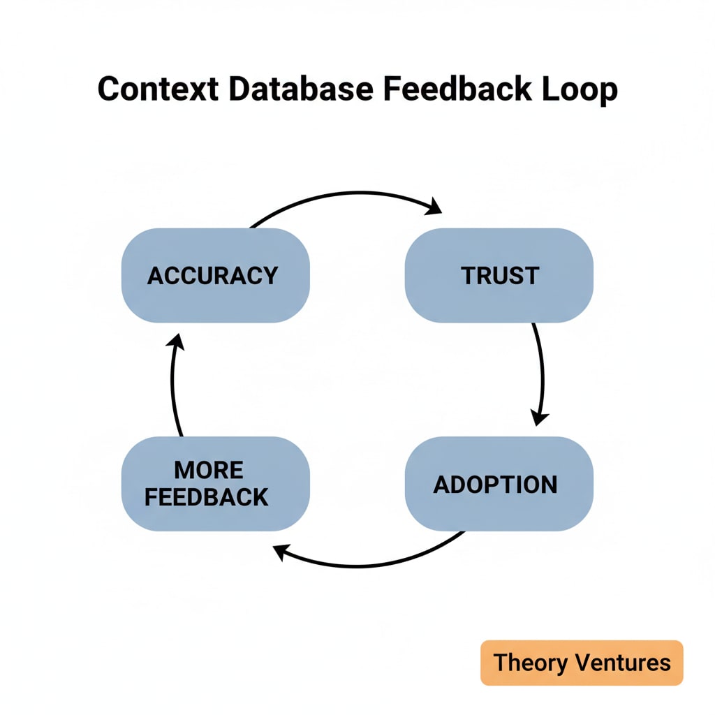 Steven’s system adapts mid-flight, retries when things break, or stops when it has something useful to show. This creates an ever-improving cycle of accuracy. Accuracy creates trust. Trust creates adoption. Adoption creates more feedback. Companies that develop the best feedback loops will build the most valuable context databases.