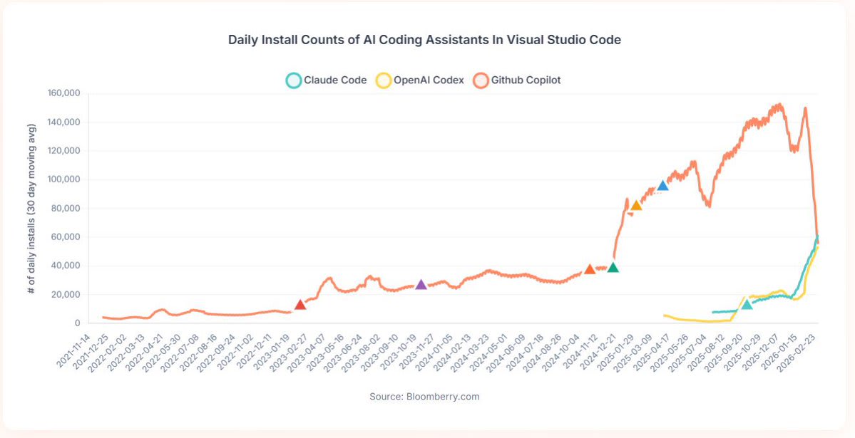 GitHub Copilot pioneered AI coding assistance. First to market. 20 million users. Then Claude Code & OpenAI Codex launched in mid-2025. Within six months, Copilot’s daily installs peaked & declined while competitors surged past 100,000 combined.1
