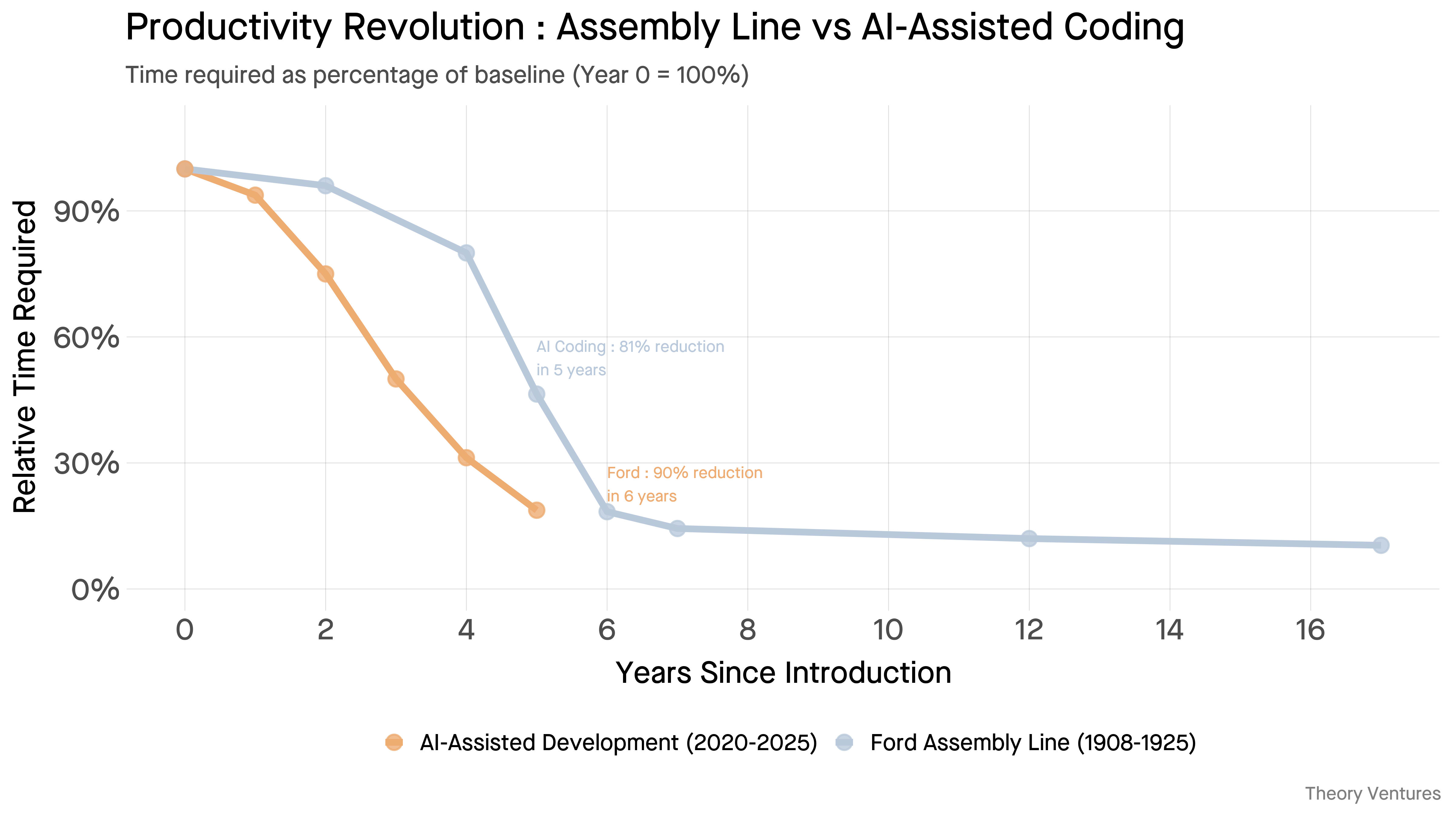 Ford took six years to achieve 90% time reduction. AI coding tools reached 81% in five. The slopes are nearly identical.