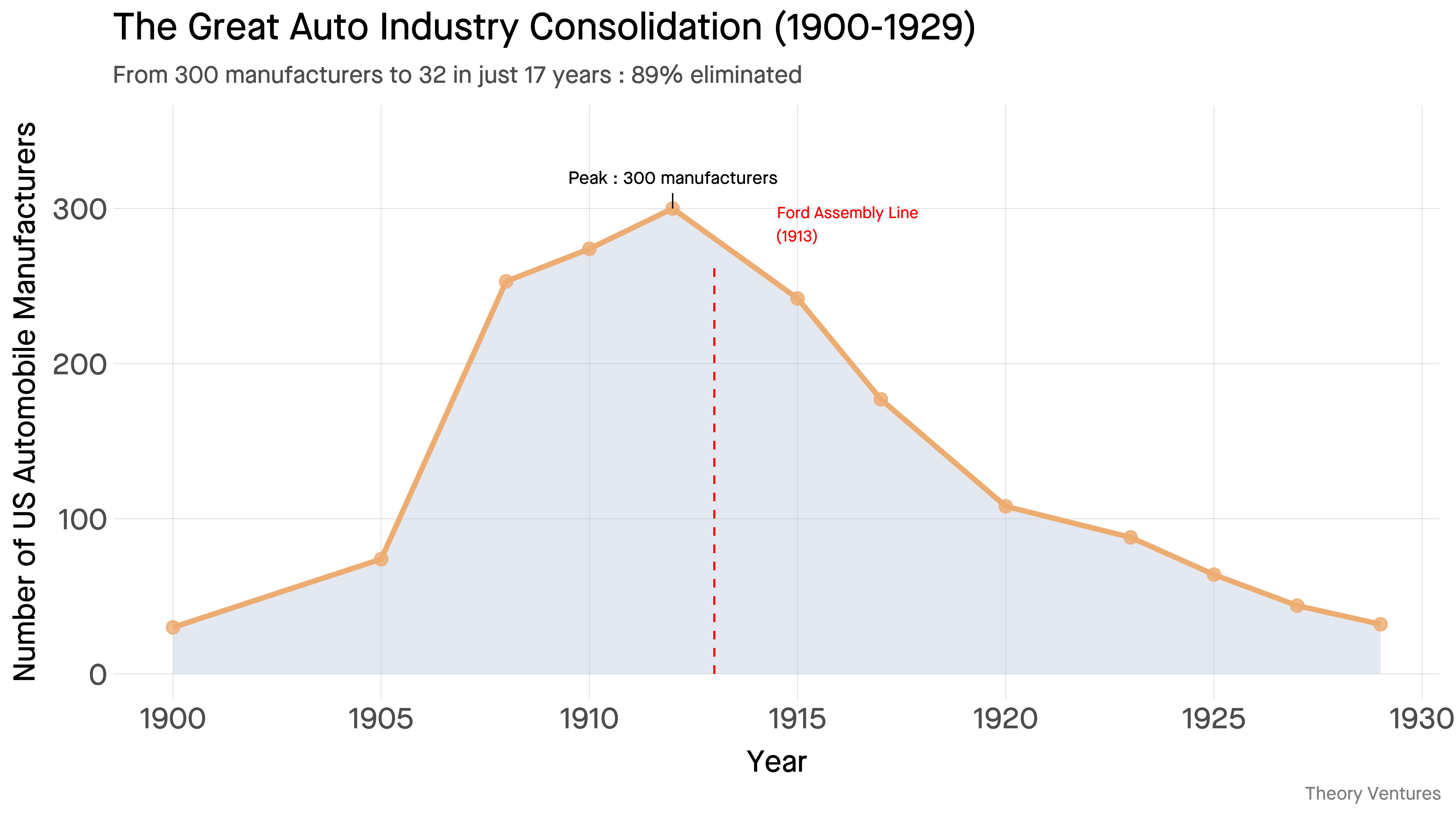 In 1908, 253 American automobile manufacturers competed for the market1. By 1929, just 44 remained. The assembly line didn’t just change how cars were made. It changed who got to make them.