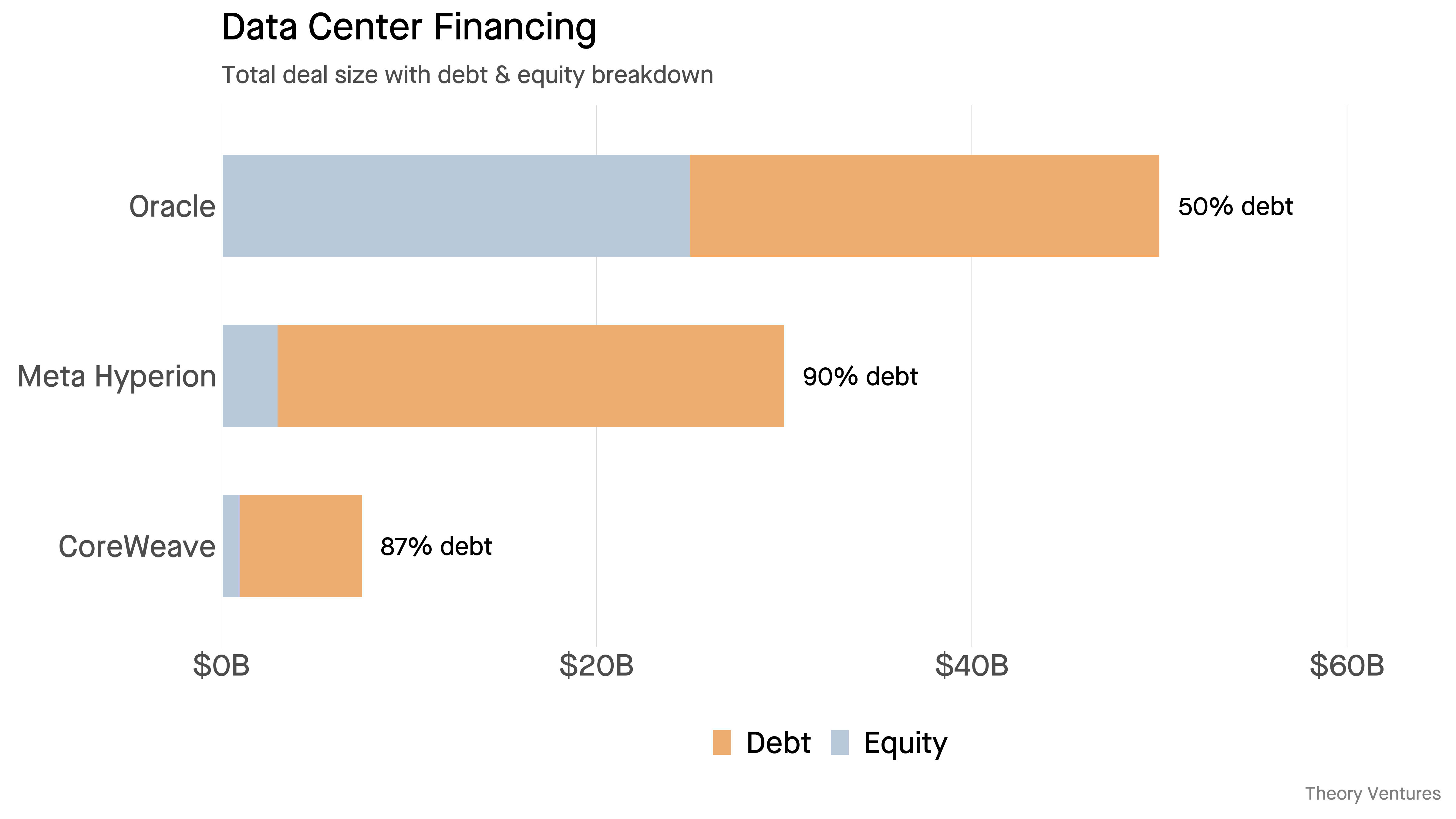 The leverage extends beyond software into infrastructure. Oracle plans to raise $50b this year for cloud buildout, roughly half in debt.5 CoreWeave financed 87% of a $7.5b expansion with debt.6 Meta’s Hyperion data center in Louisiana is higher still, at 91.5% debt ($27b debt, $2.5b equity). Blue Owl Capital led the equity, with PIMCO anchoring the debt.7