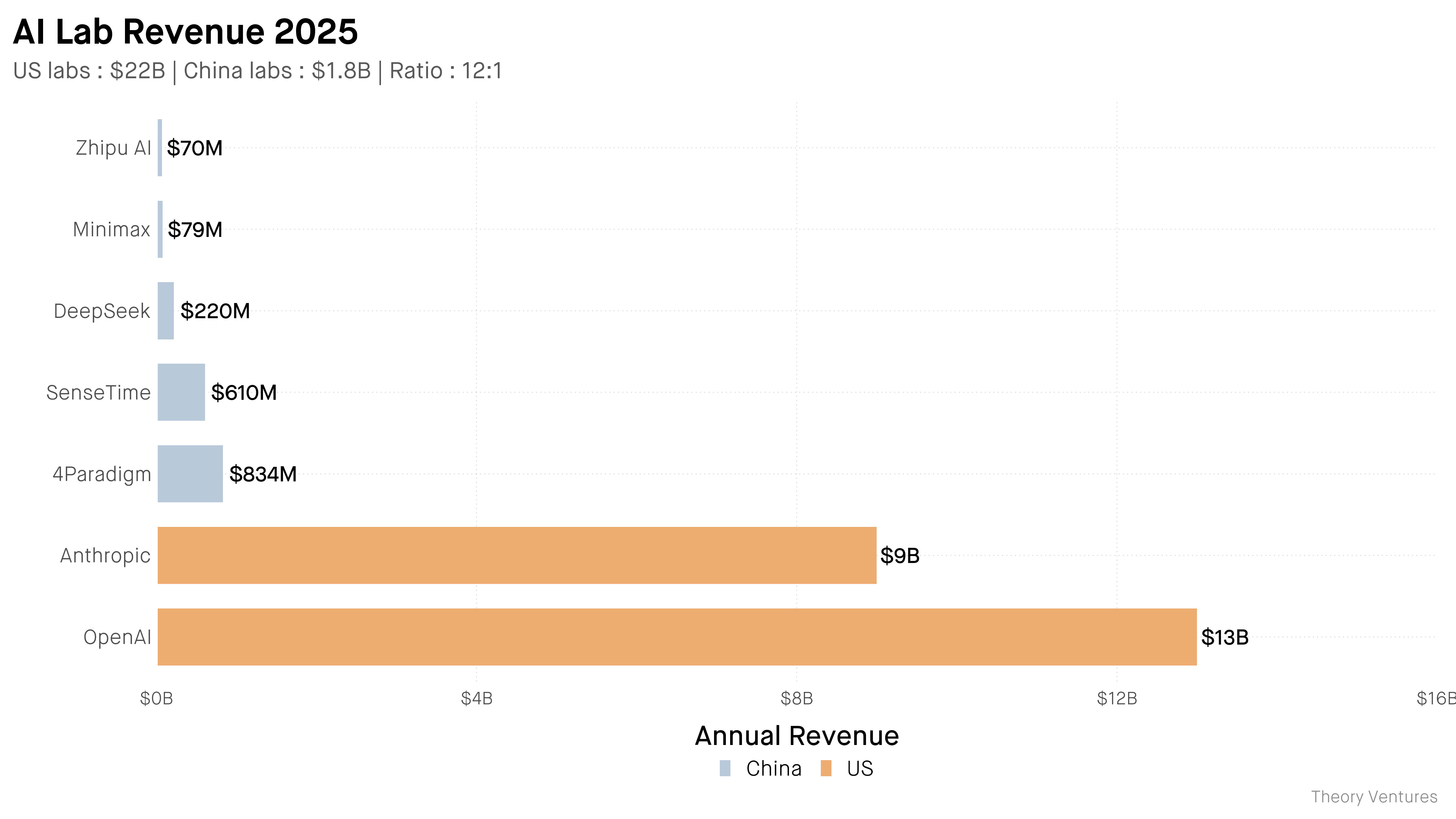AI has its generic drug moment. DeepSeek V3 matches GPT-5.2 on most benchmarks.2 It costs 90% less. OpenAI & Anthropic generated $22 billion in 2025.3 Chinese AI labs generated $1.8 billion.4 The ratio : 12:1.
